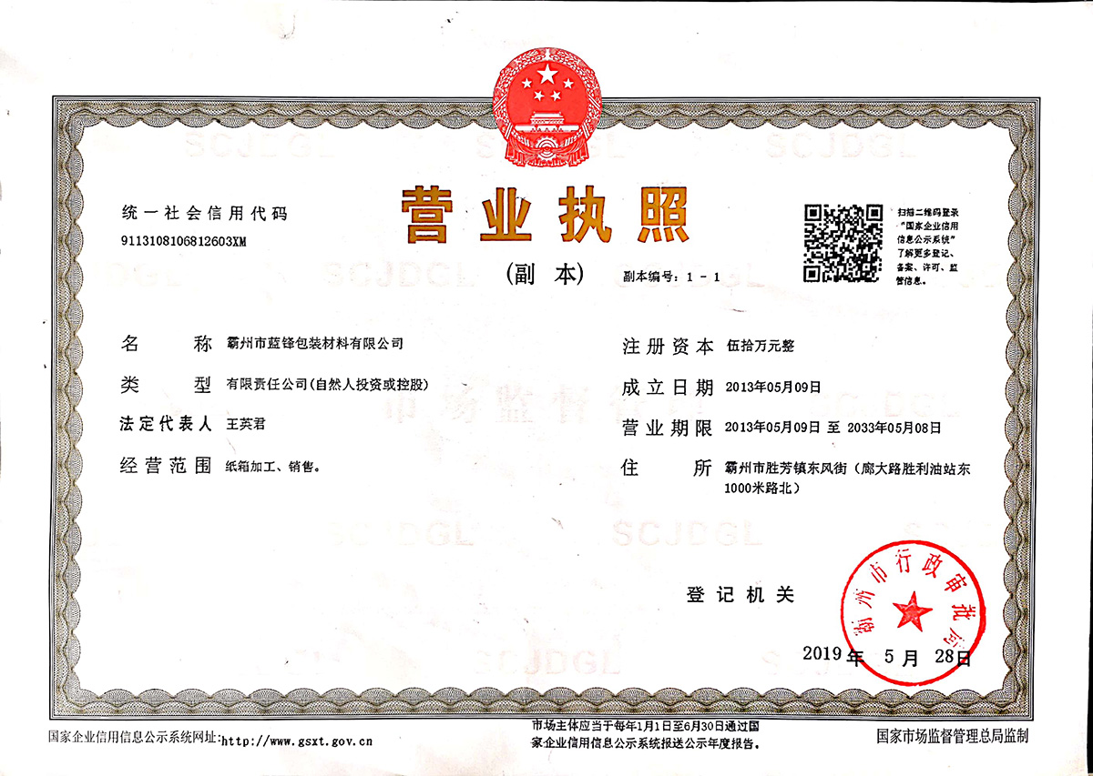 立即咨詢霸州市藍鋒包裝材料有限公司,前身為成立于1988年的勝芳鎮(zhèn)藍劍紙箱廠。是河北省較早涉足紙包裝制品的民營企業(yè)。經(jīng)過近三十年的發(fā)展,公司已經(jīng)由起初的家庭作坊發(fā)展為現(xiàn)有標準化廠房8000平米,員工50人,其中管理人員7名;年產(chǎn)紙箱上億平米的現(xiàn)代化企業(yè)。